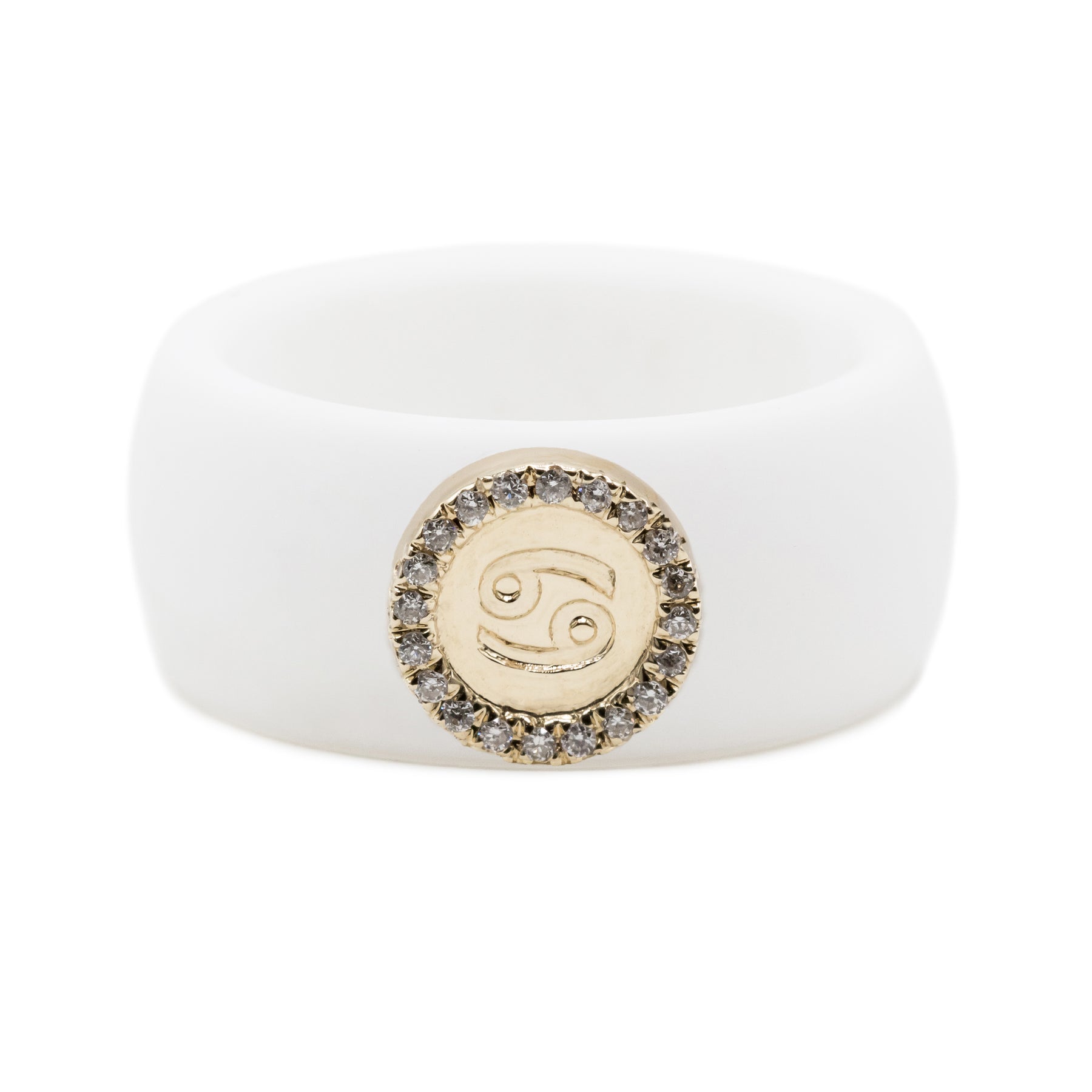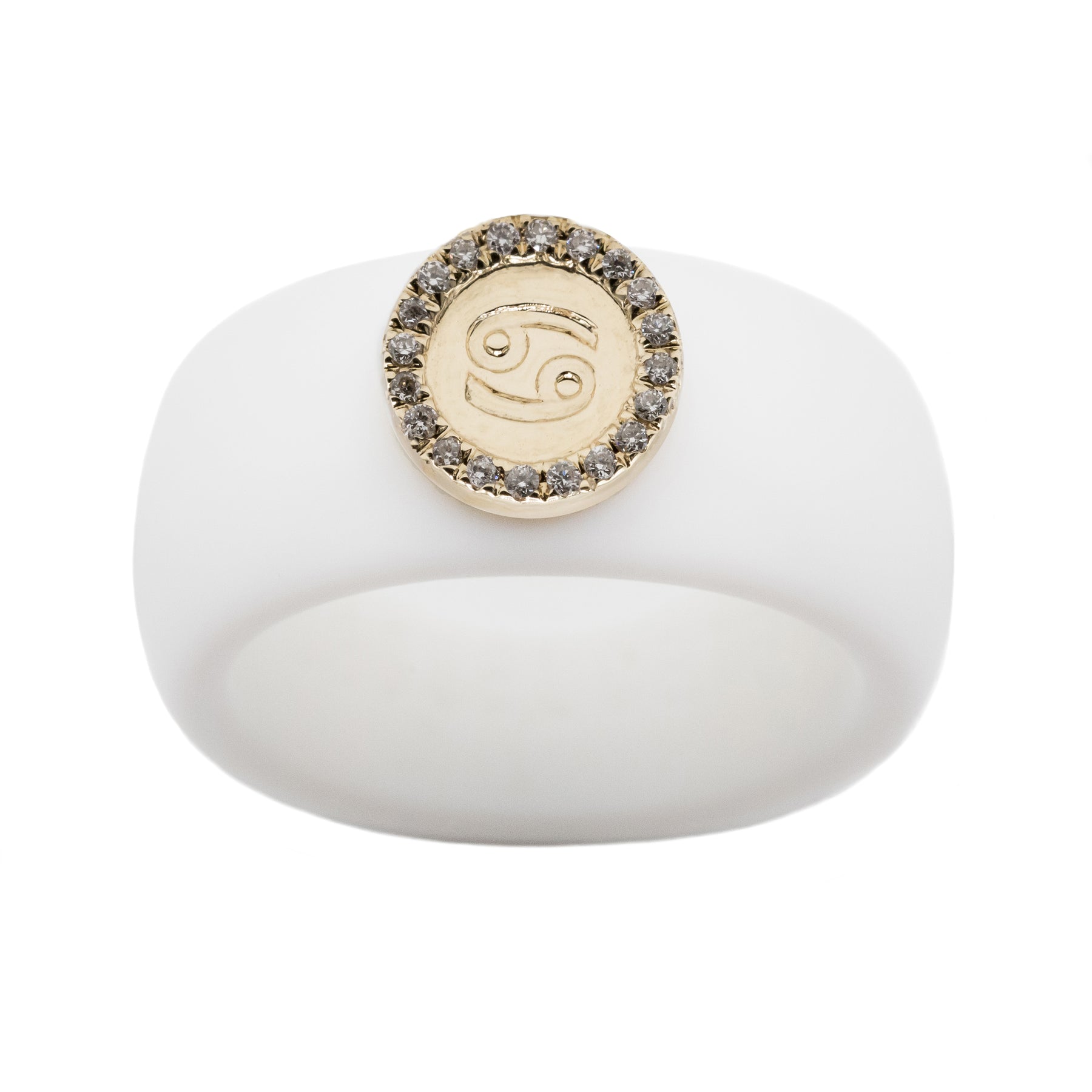 This zodiac symbol of 14K yellow gold is embellished with 0.06ct. diamonds (SI Clarity, G/H Color) and can be paired with your chosen 8.7mm silicone band in hues of black, white, nude, or Sakura pink.