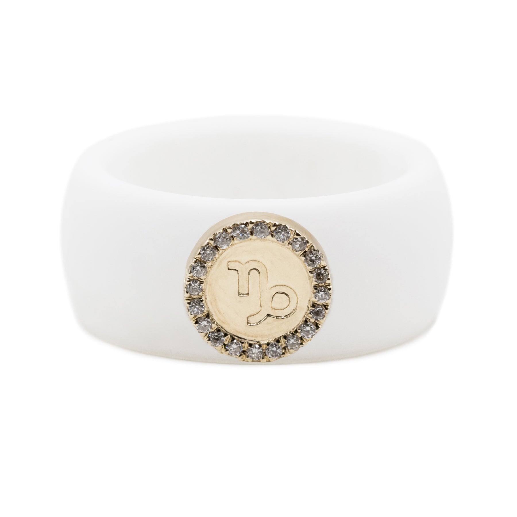 This zodiac symbol of 14K yellow gold is embellished with 0.06ct. diamonds (SI Clarity, G/H Color) and can be paired with your chosen 8.7mm silicone band in hues of black, white, nude, or Sakura pink.