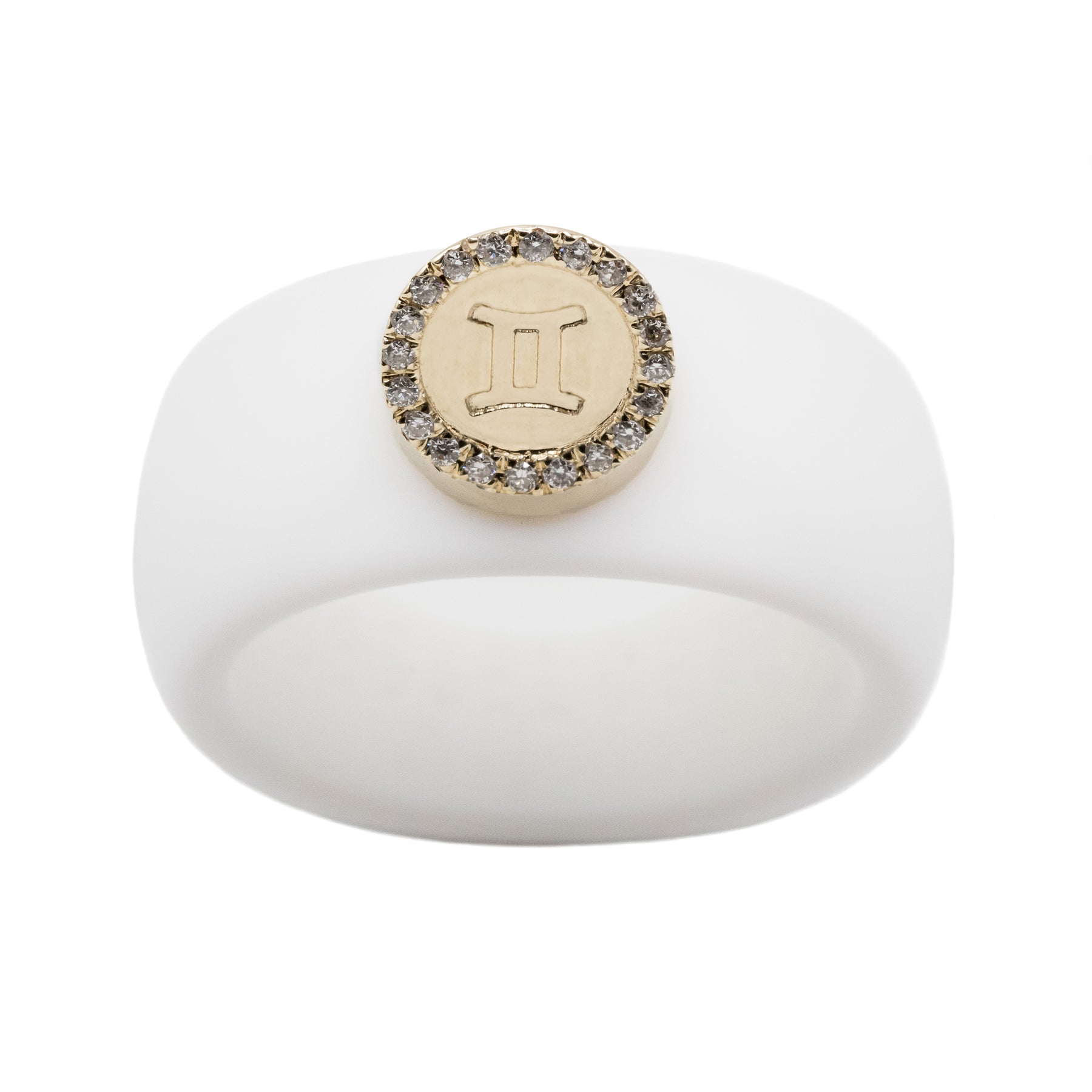 This zodiac symbol of 14K yellow gold is embellished with 0.06ct. diamonds (SI Clarity, G/H Color) and can be paired with your chosen 8.7mm silicone band in hues of black, white, nude, or Sakura pink.