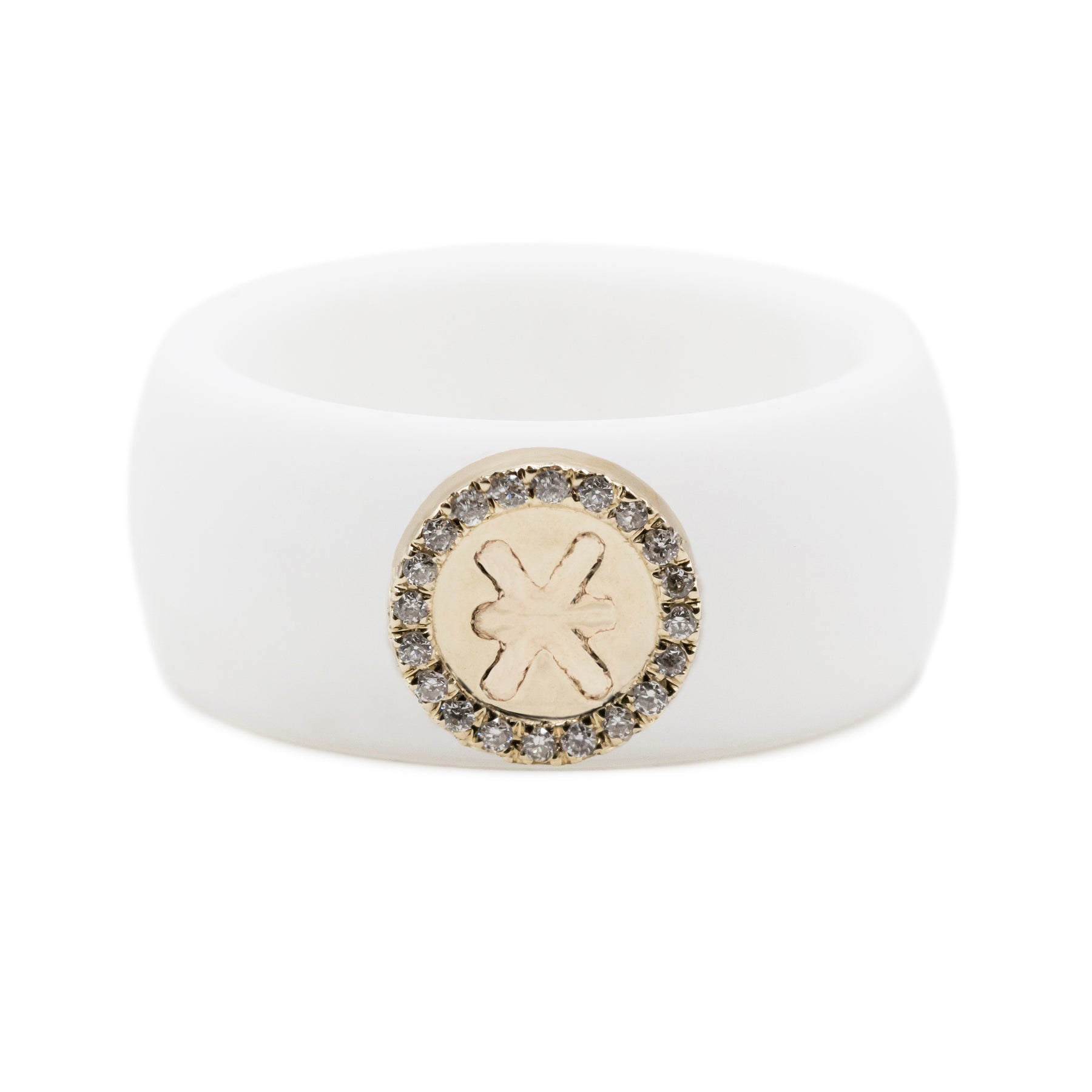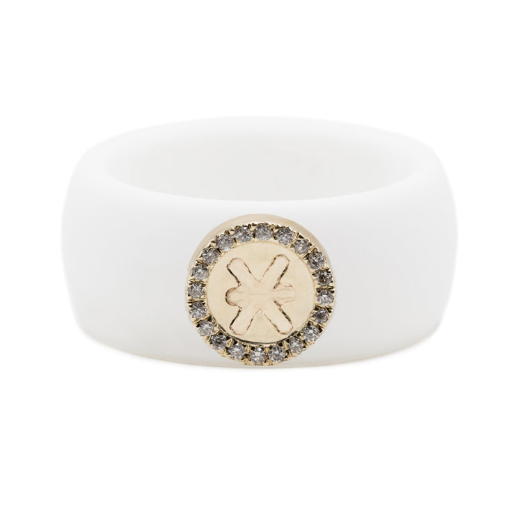 This zodiac symbol of 14K yellow gold is embellished with 0.06ct. diamonds (SI Clarity, G/H Color) and can be paired with your chosen 8.7mm silicone band in hues of black, white, nude, or Sakura pink.