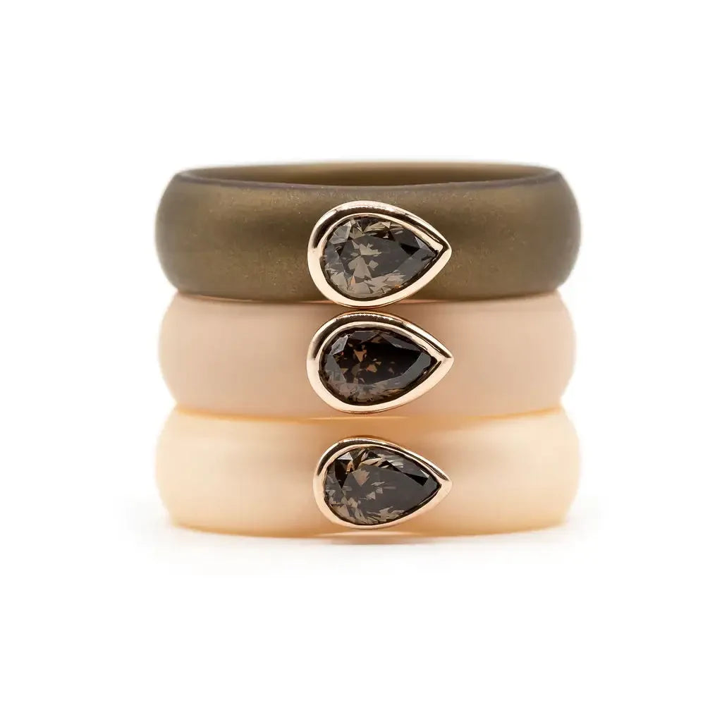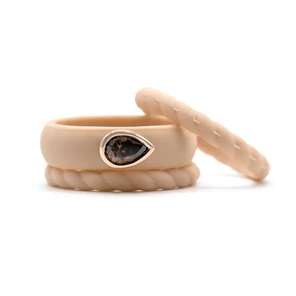 Your cognac diamond ring becomes part of your daily routine without the usual jewelry worries. Wash dishes? No problem. Hit the gym? Keep it on. The high-grade silicone flexes with your movements while protecting the precious stone setting. Available in carefully curated shapes—round, emerald cut, elongated cushion, and pear—each silicone diamond ring brings out different aspects of the cognac diamond's natural warmth.